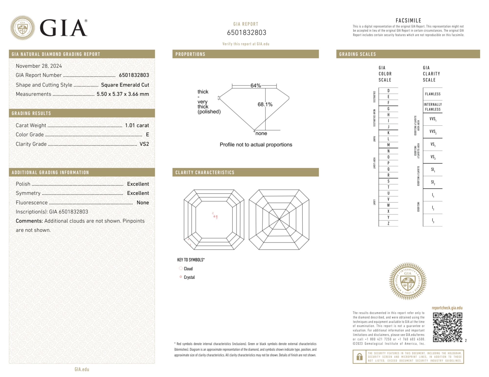 Your 1.01 carat Asscher natural diamond is graded E color (Colorless), and you can read more about E color diamonds here.