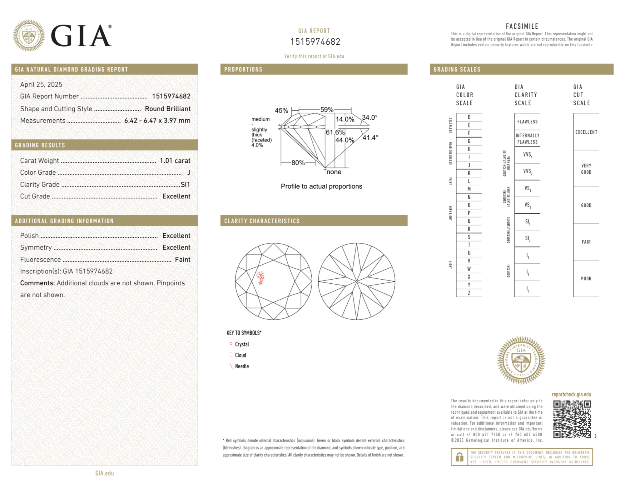 Your 1.01 carat Round natural diamond is graded J color (Near Colorless), and you can read more about J color diamonds here.