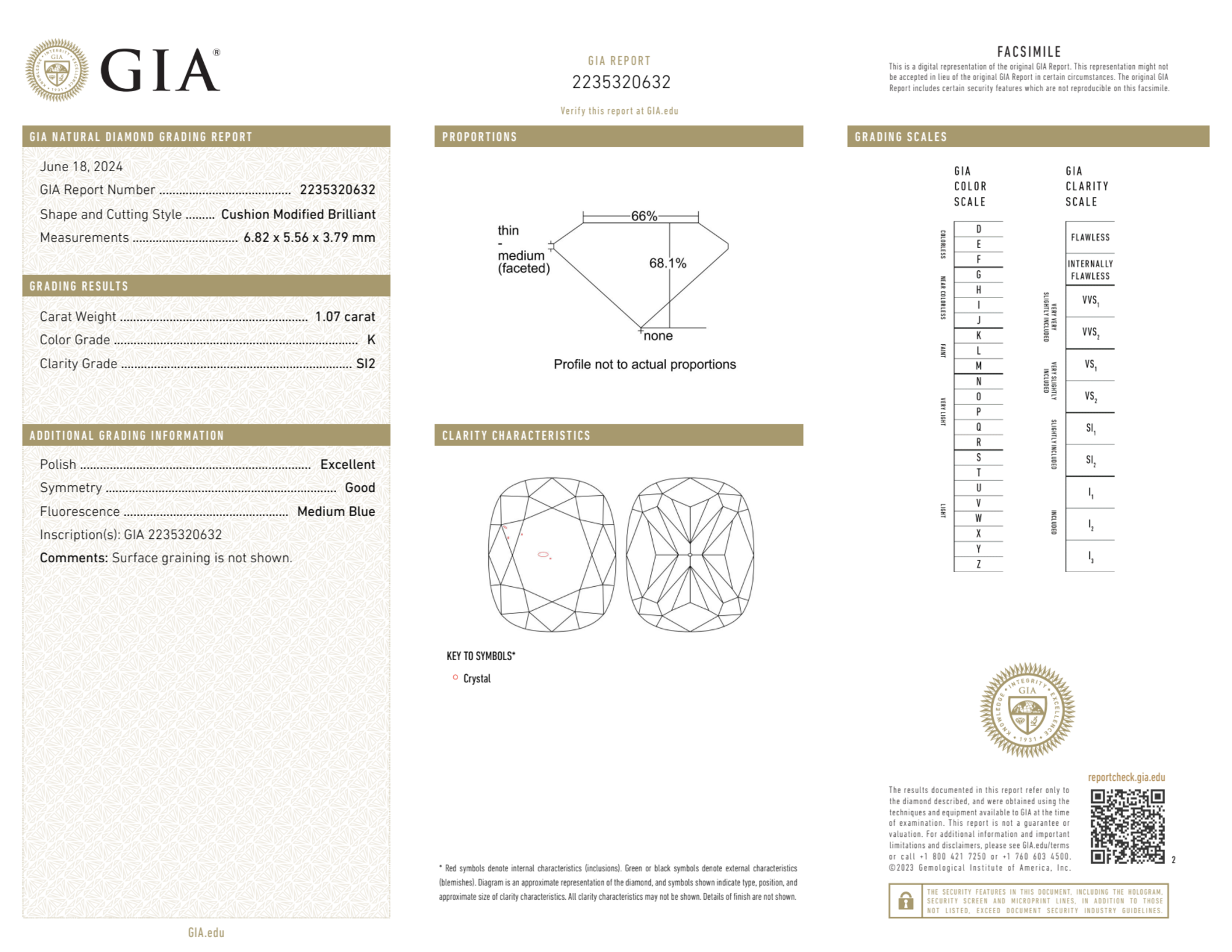 Your 1.07 carat Cushion natural diamond is graded K color (Faint Color), and you can read more about K color diamonds here.