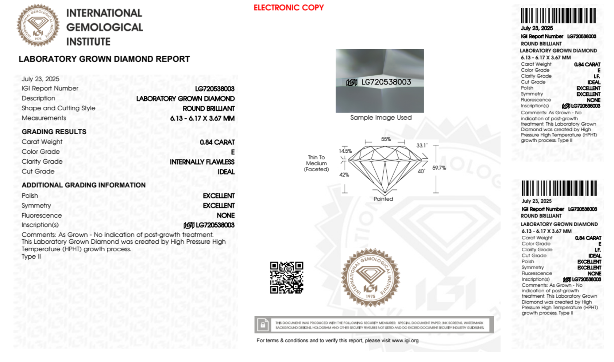 Your 0.84 carat Round lab diamond is graded IF clarity, which stands for Internally Flawless. Read more about IF clarity diamonds here, or learn more about diamond clarity in general here.